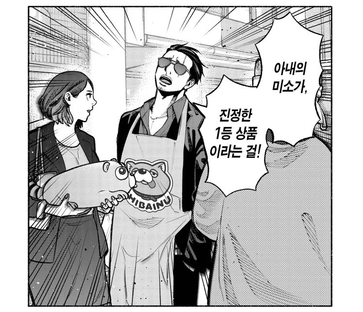 -그는 주부가 된 이후에도 검은 수트와 포마드로 고정시킨 헤어 스타일링을 고수합니다. 하지만 귀여운 '시바견'이 그려져 있는 앞치마 역시 포기하지 않습니다. 만화다 보니 다소 과장되고 억지스러운 부분이 있긴 하나, 극과 극이 만나 만들어내는 언발란스함과 유머러스함이 바로 이 만화의 묘미입니다.