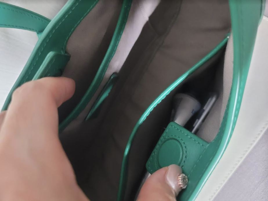 이 가방의 단점이라고 한다면 자크가 없다는 점?이에요. 대신 자석 패치가 양쪽에 있어 이 두 가지를 맞대어 적당히 클로징 됩니다. 가방 내부가 보이는 게 싫으신 분들은 조금 고민되실 수 있을 듯해요. 저도 제 소지품이 보이는 게 싫어 작은 파우치에 소지품을 넣은 후 이 파우치를 가방에 넣긴 했지만, 파우치가 보이는 것 자체도 조금 적응이 안되더라구요!