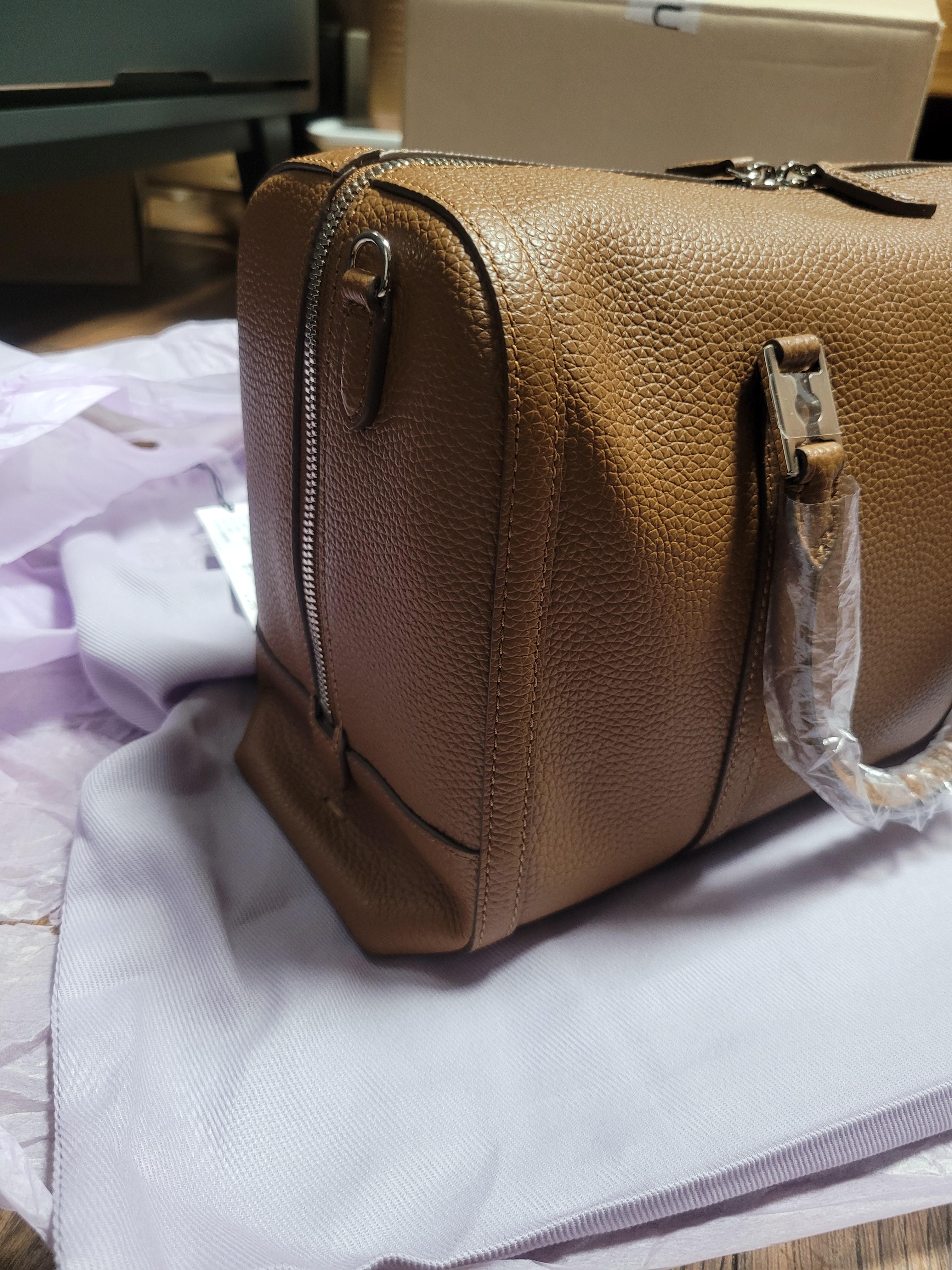 드디어 가방이 모습을 드러냈습니다. :) 첫 인상을 말하자면 깔끔 단정한 카멜 색상의 가죽 가방입니다. 고급스러워요. 견고하면서도 부드러운 느낌? 가방을 푹 누르면 유연하게 눌리면서도 가죽에 힘이 있어 다시 원래대로 모양이 잘 잡혀요. 가죽 느낌이 좋았어요.