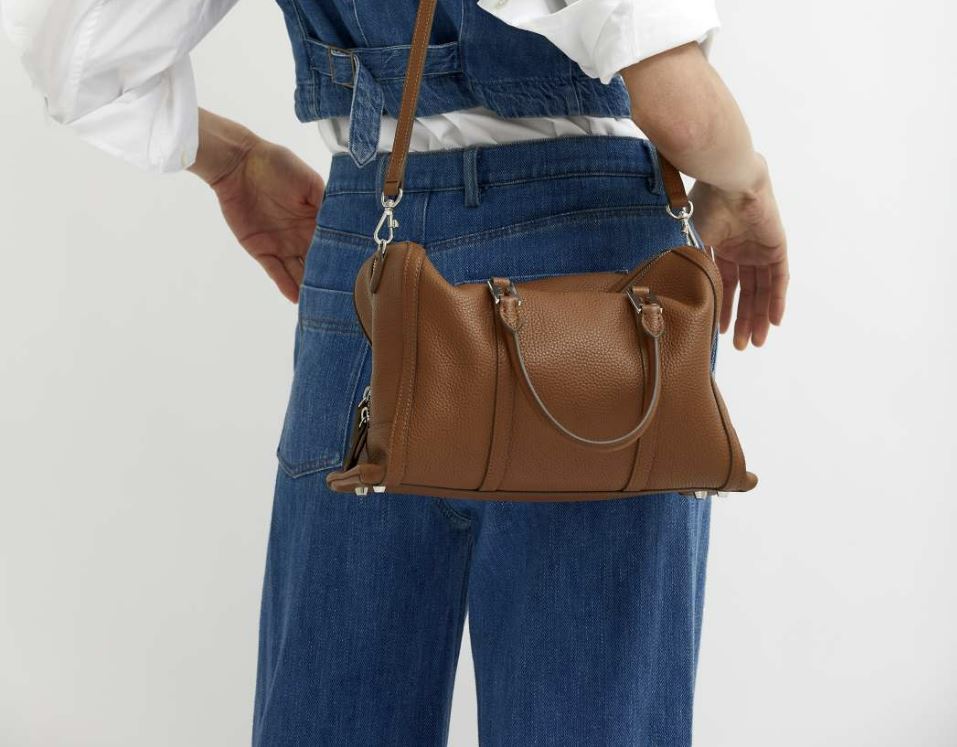 가죽 가방이고 크기가 있는 편이지만, 무게가 무겁진 않습니다. (710g) 가볍게 뿅 들리네요. 직사각형 가방으로 보이지만, 가방 양쪽 끝을 보면 분크의 대표 가방인 토크 토트 시리즈 디자인(챙 모자 모양)처럼 잡아주어 포인트를 주었어요.