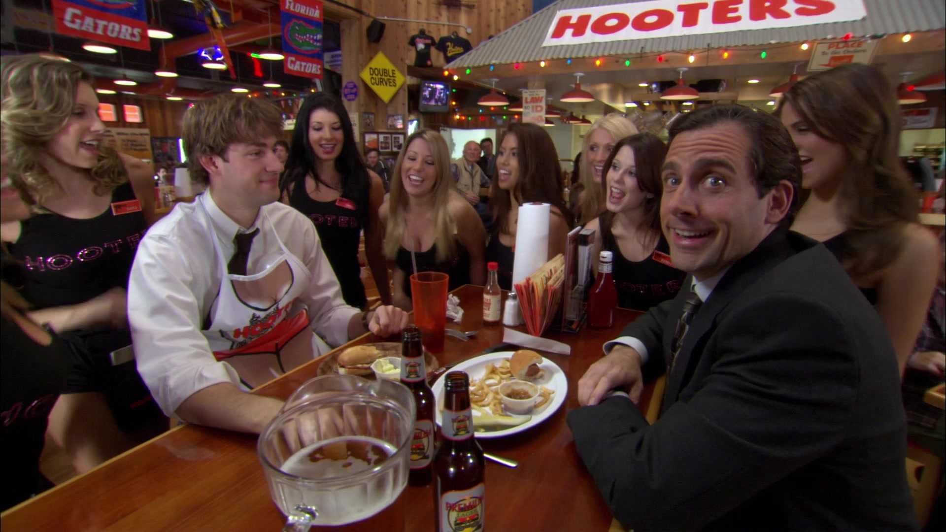 -결국 마이클이 사고를 칩니다. 억지로 짐을 '후터스'로 데려가 밥을 먹인 후 식사 비용처리 하는 것을 두고 인사팀의 토비, 고객 서비스 담당 켈리, 회계팀 케빈과 안젤라와 옥씬각씬 말다툼을 벌이다 그만 짐의 비밀을 폭로해버립니다. 위로가 필요했던 짐을 후터스로 데려가는 것은 일의 생산성을 높이기 위해서였다는 말도 안 되는 변명을 하면서 말이죠. (마이클 본인이 후터스에 가고 싶었으면서, '약혼한 직장 동료'를 짝사랑하느라 힘들어하는 짐을 위로해야 했다고 변명하는 마이클... 정말 지금까지 나왔던 에피소드 중 마이클이 가장 미워지는 순간)