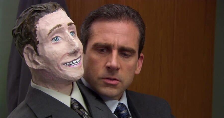 -핼러윈입니다. 출근하니 리셉셔니스트 팸이 귀여운 고양이 분장을 하고 사람들을 반겨줍니다. 마이클 역시 핼러윈을 맞아 상큼한 기분으로 출근하지만, 사실 그의 마음 한 구석은 매우 무겁습니다. 마이클은 가장 어려운 업무를 10월 말이 다 되도록 미뤄왔습니다. 그 가장 어려운 업무란, 본사에서 내려온 '인원 감축' 문제로, 마이클의 상사인 젠은 계속해서 사무실 내 직원 한 명을 자를 것을 명령합니다. 그 데드라인이 바로 10월 말이었죠. 하지만 핼러윈 전에 이 일을 마칠 순 없었을까요? 모두가 즐거워야 할 핼러윈 데이에, 그는 의도치 않았겠지만 누군가에게 핼러윈 데이 트라우마를 안겨주게 되었습니다. 일단, 사람을 자를 땐 자르더라도, 핼러윈인 만큼, 마이클은 자신과 닮게 만든 종이 반죽 인형을 어깨에 달고 하루를 시작합니다. '머리가 두 개 달린 마이클' 완성입니다!