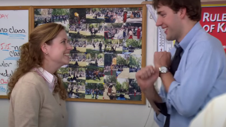 -오늘도 '드와이트 놀리기'에 성공한 짐과 팸은 드와이트에게 배를 가격 당한 후 괴로워하는 마이클을 도발하여 마이클과 드와이트와의 싸움 대결을 성사시키기에 이릅니다. 이에 넘어간 마이클은 결국 점심시간을 이용하여 드와이트와 실력 겨루기를 하게 되고, 직원들은 싸움 구경까지 하게 되죠. 참고로 마이클은 이 싸움을 위해 점심시간을 무려 1시간을 늘렸습니다. 도장에 도착한 던더 미플린 스크랜턴 지점 직원들은 싸움 구경이나 하면서 일은 적게 할 수 있으니 더 이상 좋을 일이 없습니다. 완벽한 팀워크로 모두를 이곳으로 이끈 팸과 짐은 분위기가 좋았지만, 약간의 어색한 순간이 찾아와 둘을 당혹스럽게 합니다. 당황한 짐은 팸의 눈치를 보며 어찌할 바를 모릅니다.
