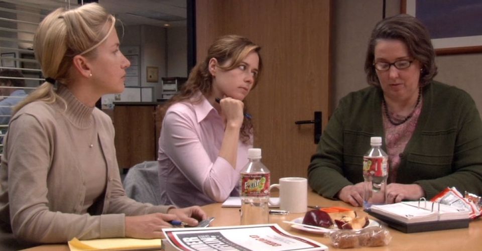 - 사내 이벤트 준비팀에는 회계팀의 안젤라(안젤라 마틴 分)와 리셉셔니스트 팸, 그리고 영업사원 필리스(필리스 스미스 分)가 있습니다. 무언가에 대한 호불호가 강하고 이를 표현하는데 전혀 개의치 않는 안젤라 앞에서 소심한 스타일의 필리스는 눈치를 보며 아이디어를 냅니다. 안젤라가 '안된다'라고 할 경우 그 아이디어는 버려질 가능성이 크기 때문입니다. 팸은 그 사이에서 둘을 중재해보려고 애를 씁니다. 마이클은 바쁜 사람들을 이렇게 불러놓고는 정작 생일 주인공이 먹지도 못하는 유제품인 아이스크림 케이크도 준비하라며 밉상짓을 합니다.