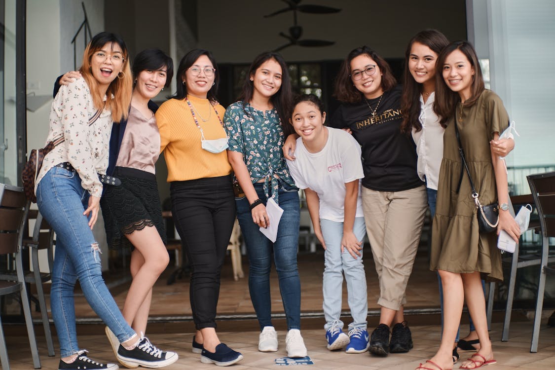단체 사진을 찍을 때 양 끝에 서면 상대적으로 더 커 보일 수 있어요. 억지로 중앙에 설 필요는 없지만, 중앙에 자리를 잡으면 더 슬림하게 보일 수 있습니다.