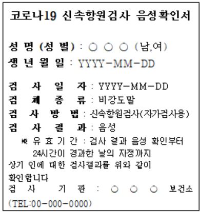 ※ 관리자나 감독 없이 개인이 집에서 실시한 자가키트 검사 결과에 대해서는 증명서가 발급되지 않습니다.