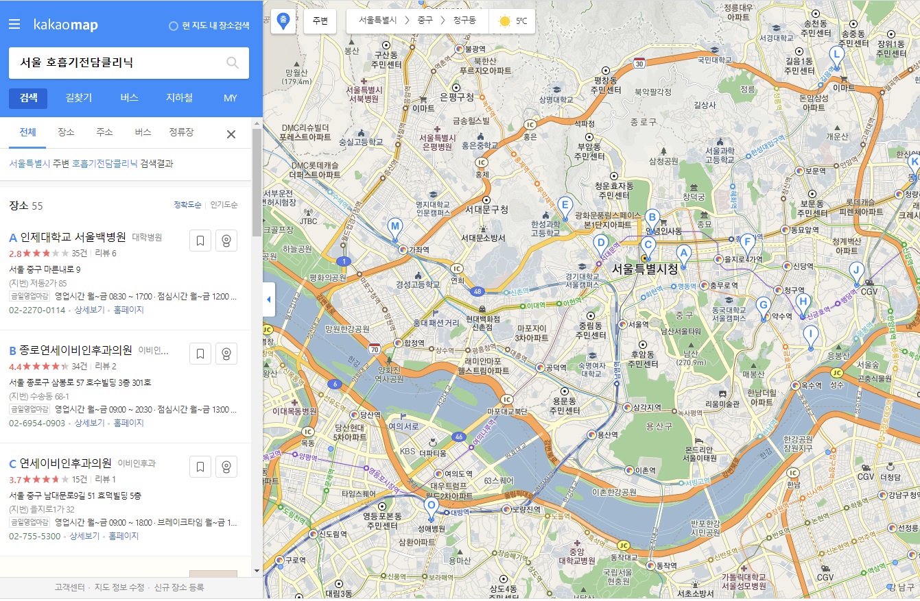 -다음 '카카오맵'이나 네이버에서 제공하는 '네이버 지도'에 원하는 지역 + 호흡기전담클리닉 or 호흡기 진료지정 의료기관 검색 시 아래와 같이 결과가 확인됨