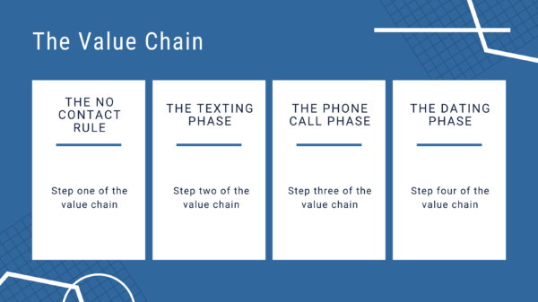 저희가 만든 개념 중 '가치 사슬(value chain)'이라는 게 있는데요, 이는 저와 제 팀이 5년 넘게 정제해 온 개념으로서 전 연인을 찾기 위한 일종의 '청사진'과 같은 역할을 하고 있습니다. 이 '가치 사슬'은 이별 후 연락 금지 룰(No Contact Rule) 단계에서부터 시작하여 문자, 전화의 단계를 거쳐 실제 만남까지 이어지는 과정을 뜻하는데요, 재밌게도 이 개념에 대해 알려드리면 모두 최대한 빨리 이 과정을 진행하고자 하는 분들이 많습니다.